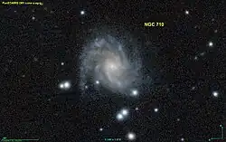 NGC 710 is a spiral galaxy located 260 million light-years away[2] in the constellation Andromeda. It was discovered by the Irish engineer and astronomer Bindon Blood Stoney on October 28, 1850[3][4] and is a member of the galaxy cluster Abell 262.[5][6][7][8][9]