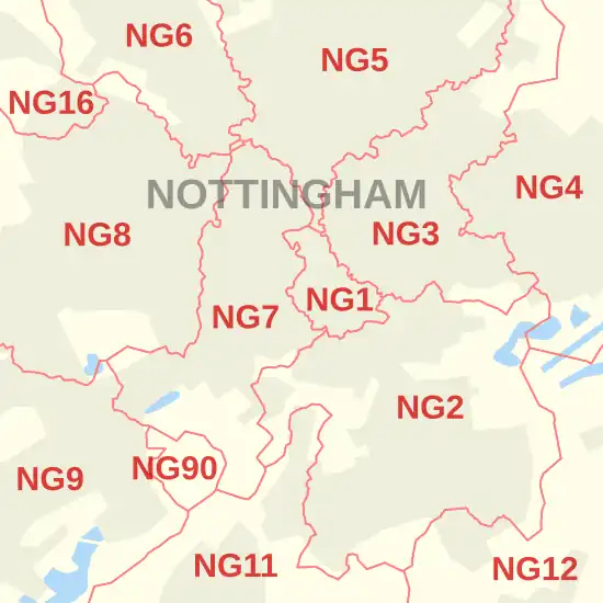The NG postcode area, also known as the Nottingham postcode area,[2] is a group of 29 postcode districts in the East Midlands of England, within seven post towns. These cover southern and central Nottinghamshire (including Nottingham, Mansfield, Sutton-in-Ashfield, Newark-on-Trent and Southwell), parts of south-west Lincolnshire (including Grantham and Sleaford) and small parts of Derbyshire and Leicestershire. The NG postcode area is one of six with a population above 1 million.[3]