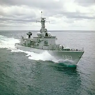 HNLMS Van Nes (Dutch: Hr.Ms. Van Nes) is a ship of the Karel Doorman class of multi-purpose frigates of the Royal Netherlands Navy where it used the radio call sign was "PAMI".[1] Built by the shipyard Koninklijke Schelde Groep in Vlissingen. The ship is named after the Dutch Admiral Aert Jansse van Nes. She was sold to the Portuguese Navy where the ship was renamed NRP Bartolomeu Dias.