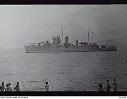 Armament consisted of three 120-millimetre (4.7 in) guns in single mounts on the ship's centreline, with two forward and one aft. Four 2-pounder (40 mm) pom-pom anti-aircraft (AA) guns were fitted, while four depth charge throwers provided an anti-submarine armament.[2] In 1943, the 40 mm guns were removed and replaced by five single-mounted 20 mm (0.79 in) AA cannon.[3]