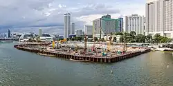 NS Square is a future outdoor multi-purpose venue in the Downtown Core area of Marina Bay, Singapore, designed by local architectural firm WOHA, in collaboration with design firm, Populous.[1] NS Square will occupy the former site of The Float@Marina Bay. It was first conceptualised in January 2020 to be a permanent replacement of the existing temporary floating platform.[2][3][4] Construction of NS Square has started in March 2024, with completion expected in 2027.[5] Along with a 30,000-seat grandstand, NS Square will house a National Service-themed gallery, community sports facilities and a public waterfront promenade.[2]