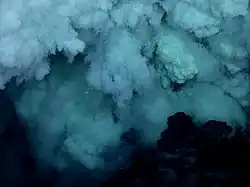 2 droplets were emitted prior to the extrusion of lava, which was itself accompanied by the emission of sulfur[20] and ash.[71] Turbid plumes similar to these in 2004 were observed again, initially obscuring the view of the seafloor. Presumably these plumes were caused by a collapse of the cinder cone.[18] - In 2009, the extrusion of lava was observed. It would slowly emerge from the vent, and blocks of lava would fragment and tumble down at the side of the vent. This process was accompanied by intense degassing, a yellowing of the plumes from sulfur[72] and emission of tephra.[73] A seismic swarm took place northwest of NW Rota-1 in April 2009 and was presumably caused by magma intrusion,[26] which may relate to the subsequent eruption.[74]