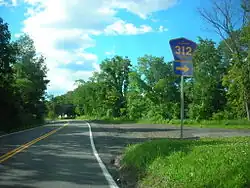 Continuing through the town of Westerlo, NY 143 passes south of a large airstrip located in a rural area between NY 143 and CR 412. The route remains on an eastward track for another half-mile (0.8 km), meandering through dense woods before turning southeastward into an open area with a handful of isolated homes. NY 143 soon enters the hamlet of Dormansville, where it intersects with the southern terminus of CR 312 and passes some small businesses ahead of a junction with NY 32 just east of the community. NY 143 joins NY 32, forming an overlap that takes both roads eastward toward Alcove Reservoir. The conjoined routes connect two sections of CR 411 and pass over Hannacrois Creek before crossing into the town of Coeymans as Indian Fields Road.[3]