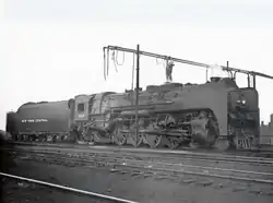 No. 3001 is the second member of the L-3a class built in October 1940 and was first situated at the Elkhart, Indiana roundhouse.[2][15] It was initially assigned to pull heavy freight trains and troop trains during World War II.[2][14] After the war ended, the locomotive and the other L-3s ran on the mountainous Boston & Albany (B&A) subsidiary, replacing the B&A J-2 Hudsons on pulling the Lake Shore Limited,[16] New England States,[15] and New England Wolverine[17] passenger trains between Boston, Massachusetts and Albany, New York.[2][18] They even hauled NYC's famous 20th Century Limited passenger train and Pacemaker fast-freight train between Croton-Harmon and Buffalo, New York.[19][20][b]