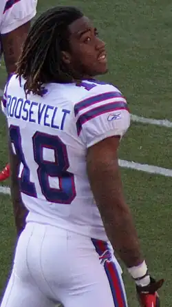 Roosevelt went undrafted in the 2010 NFL draft. He was signed as an undrafted free agent by the Buffalo Bills on April 24.[13] Roosevelt was cut by the Bills on final cuts on September 4, 2010,[14] but signed to their practice squad on September 5, 2010.[15] On November 27, 2010, Roosevelt was promoted to the active roster after coach Chan Gailey said he did an "excellent job" on the practice squad.[16] He made his NFL debut the following day in a loss to the Pittsburgh Steelers. The following week, he recorded the only tackle of his NFL career, bringing down Greg Camarillo after a 17-yard punt return.[17][18] On December 19, 2010, he was targeted with and caught the first passes of his NFL career,[17] reeling in two of three throws from Ryan Fitzpatrick for 35 yards.[19] He ended the season with a total of nine receptions for a total of 139 yards, one carry for three yards and two kick returns for 31 yards.[17]