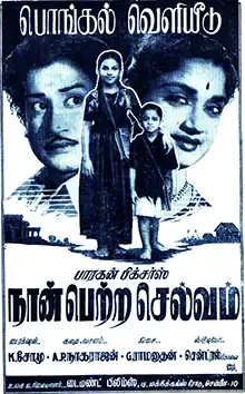 Naan Petra Selvam is a 1956 Indian Tamil-language drama film directed by K. Somu and written by A. P. Nagarajan, starring Sivaji Ganesan and G. Varalakshmi.[1] The film was released on 14 January 1956.[2]