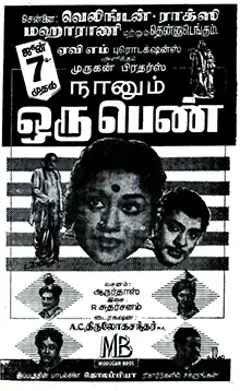 Naanum Oru Penn (transl. I too am a woman) is a 1963 Indian Tamil-language drama film directed by A. C. Tirulokchandar and written by K. P. Kottarakkara. The film stars S. S. Rajendran and R. Vijayakumari, with S. V. Ranga Rao, M. R. Radha, S. V. Subbaiah, C. K. Nagesh, Rajan and C. S. Pushpalatha in supporting roles. It revolves around a dark complexioned and uneducated girl and how she convinces everyone that more than appearance and education, it is the character which is important for a woman.