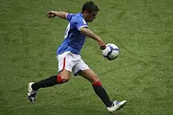 With the departure of Alex McLeish and the arrival of Frenchman Paul Le Guen, Novo looked set to leave Rangers. However, a proposed transfer to English First Division club Coventry City fell through on transfer deadline day.[17] Novo initially found his appearances sporadic, featuring in the first game of the season then waiting seven weeks for his second but after a mixture of poor results, injuries and his good performances for the reserves Novo returned to the first team. His first goal of that season, and in over a year, was during a 3–2 UEFA Cup win over Livorno on 19 October 2006.[18] The following match, Novo came off the bench to score a late winner against St Mirren in a 3–2 win.[19] He then started the next game, Motherwell held Rangers to a 1–1 draw with Novo named Man of the Match. His rejuvenated form continued with goals against Heart of Midlothian,[20] Maccabi Haifa[21] and AJ Auxerre.[22] Novo continued to be a regular when Le Guen was replaced with Walter Smith.