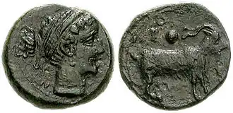 | [NA-KO]-N[AION] Female head right, wearing hair band | Goat right; pellet above, grain-ear before.. |