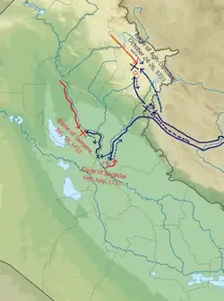 Besieging Kirkuk with a residue force of 7,000 the main Persian army marched on until they defeated an Ottoman army near Baghdad and then proceeded to encircle the city itself in preparation for a siege after a hard fought campaign of maneuver were Nader managed to cross the Tigris. Ahmad Pasha would prove a stubborn defender of the city and held out until the approach of a relief effort in the form of an army of 80,000 under Topal Pasha.