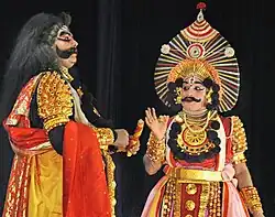 A popular folk dance in Ankola is Yakshagana. Yakshagana (ಯಕ್ಷಗಾನ) is a traditional theatre form that combines dance, music, dialogue, costume, make-up, and stage techniques with a unique style and form. This theatre style is mainly found in coastal regions of Karnataka and Kerala. Yakshagana is traditionally presented from dusk to dawn. Its stories are drawn from Ramayana, Mahabharata, Bhagavata and other Hindu epics.[2]