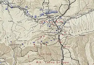 Nagyszeben (Sibiu/Hermannstadt) was occupied on 2 September by the forward troops of the Romanian 1st Army. However, the Romanians evacuated the city on the following day.[10] The Romanians were plainly apprehensive that, in order to keep Nagyszeben under occupation, they would have to extend their bridgehead-like formation beyond capacity.[11] With neither side actually occupying Nagyszeben, an Austro-Hungarian service battalion proceeded to evacuate government property from the city throughout the following week, unhindered by either side.[12] This battalion, comprising 300 Landsturm, was commanded by Major Reiner.[13] The evacuation was completed on 10 September.[14] Also on 10 September, the Romanian 1st Army captured Sellenberk (Șelimbăr/Schellenberg), two miles southeast of Nagyszeben. This marked the end of the Romanian advance in the area for the ensuing fortnight.[15][16] Sellenberk became the center of the main Romanian position north of the Turnu Roșu Pass.[17]
