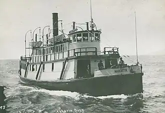 Nahcotta was built for the run across the Columbia River from Astoria, Oregon to Ilwaco, Washington.[1] It took about two hours for the steamer to reach Ilwaco from Astoria.[5] Once at Ilwaco, the steamer would meet a train from the Ilwaco Railway and Navigation Company which would then carry passengers and freight to points on the Long Beach Peninsula, then as now a vacation area.[6]