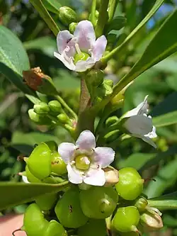 Flowers are present all year and are arranged in groups of 2 to 6 in leaf axils on stalks 4.5–18 millimetres (0.2–0.7 in) long. They are a tubular bell shape with a fragrant odor and there are 5 lance-shaped sepals and 5 petals forming the tube. The tube is generally white or pink with darker blotches at the base of the lobes and the tube is usually 1.5–3.5 millimetres (0.06–0.1 in) long with lobes about the same length. The fruit is a waxy white drupe that is 8 millimetres (0.31 in) in diameter, juicy, and bitter to taste. The fruit usually dry out and remain attached to the branch.[2][3][4]