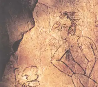 ![]() A wall drawing of a man in rare 3/4 profile, performing ritual genital bloodletting | |