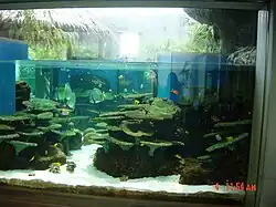 The aquarium displaying tropical fish from the Amazon River tank is the one of Japan's largest tank dedicated to freshwater fish.[7] Other exhibits include freshwater fish exhibits for each basin of the Naka River, which simulate the upstream and downstream areas of the river, various Japanese freshwater fish, tropical saltwater fish, an aquarium where visitors can touch and feel the fish, and an exhibition area for rare Japanese fish.[1]