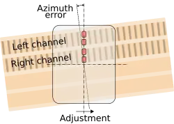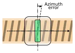 In magnetic recording, "azimuth" denotes the orientation of the magnetic head gap – a narrow, vertical slit that spans the height of the track – with respect to the direction of tape travel.[3] "Absolute azimuth", the angle between the gap and the direction of tape travel, must be set at precisely ninety degrees for correct replay of treble signals. In practice, the main goal is perfecting the "relative azimuth" – the angle between the recording and replay magnetic gaps, which must be as low as possible.[3] A two-head deck, in theory, has zero relative azimuth at a given point in time but in the long term its absolute azimuth drifts away from ninety degrees.[3] The advantage disappears when a two-head deck replays tapes recorded on equipment with an unknown absolute azimuth error.[3]