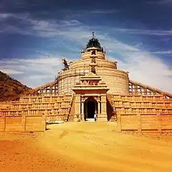 The temple is noted for the worship of the tutelary deity Nakoda Bhairava, who is popular among devotees.[20] The Bhairava icon is red in colour, four-armed and has a moustache with a dog as the vahana. He carries in the lower hands a kapala and a damaru and khadga and Trishula in his upper hands.[21] Nakoda Bhairava is an important guardian deity in the Śvetāmbara sect.[22][23][1] Nakoda Bhairava is believed to grant the wishes of devotees that make offering there; performing puja (praying) brings prosperity.[12][5][24] Devotees consider the deity a business partner and offer a share of their profits to him.[2] Nakoda Bhairava is also linked to tantra and is believed to free people from spirit possession.[25][26] The food offering (prasada) is an uncommon practice in Jainism. However, at Nakodaji, prasada is offered to Nakoda Bhairava.[note 2][28] The prasada is required to be consumed inside the temple and should not be taken outside.[29]