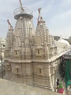 The temple is famous for its architecture.[12] It is a large structure with a highly decorated façade. The principal shrine is a large domical structure, with 52 domical sub-shrines along its axis.[13][6] The temple is constructed using makrana marble and Jaisalmer's sandstone. The elaborate shikhara of the temple is regarded as a rare example of architectural and sculptural elegance.[4] The temple has two life-sized elephant sculptures with riders on either side of its entrance.[14] The temple also has bhonyra (underground chamber) housing 35 idols.[6]
