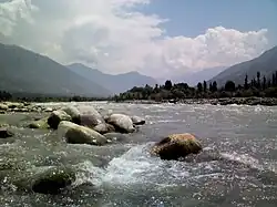 The Sind River forms the Sind Valley. The source of the river lies in the Machoi Glacier at an elevation of 4,800 m (15,700 ft), east of the Amarnath temple and south of the Zoji La.[1][2] It flows through Panjtarni (a camping site of Amarnath yatra) southwards up to Domail where it joins a tributary which doubles its flow from the Kolhoi Glacier. It then flows mostly westwards along the NH 1D and is fed by many glacial streams on its way to Ganderbal town. At Kichpora Preng it is fed by the Wangath river which flows down from the Gangabal Lake, which is considered the source of the river per tradition.[3] The major tributaries of the river are: the Amarnath stream, Kolhoi Grar, Shitkadi Nallah, Gund Nallah, Surfraw Nallah and Wangath Nallah.