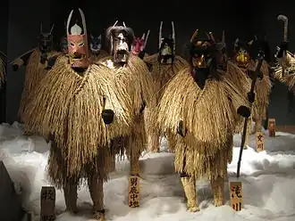 The Namahage (生剥げ, なまはげ)[1] are demonlike beings portrayed by men wearing hefty oni (ogre) masks and traditional straw capes (mino) during a New Year's ritual, in local northern Japanese folklore of the Oga Peninsula area of Akita Prefecture.