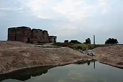 The fort is located in the centre of Namakkal town over a hillock made of single rock named Namagiri.[2] The fort is located on the top of the rock, 75 m (246 ft) tall. There is a Narasimha Murthy temple and a mosque that are located within the fort, both of which are popular tourist attractions of the town.[4] Kamalalayam tank, located at foothills, is commonly associated with the fort.[5] The fort is made up with well-cut blocks of the same stone as the hill and cemented to the rock by mortar. The higher portions of the fort are held by their own weight and accurate fitting. The area of the fort is around 1.5 acres (6,100 m2) on the top. In modern times, an 8 ft image of Hanuman is reinstalled on the fort, facing the Narasimha image on the top of the fort. The fort is maintained by the Archaeological Survey of India.[6]