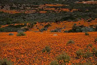 Namaqua National Park is a South African national park situated on the edge of the Atlantic coast of Namaqualand (an area covering 440,000 km2 located within the semi-desert Succulent Karoo biome).[2][3] This biome is a biodiversity hotspot with the largest concentration of succulent plants in the world.[3] The park also has an arid environment with succulent plants.[4] The park was created to protect its endemic flowers.[5] During the spring, wildflowers bloom there in a spectacular fashion.[3] The park's main tourist attraction is this abundant spring bloom of brightly coloured wildflowers.[4][6]