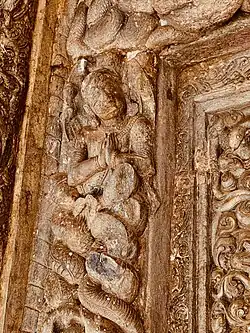 Right: Entrance pillar relief (Thrichittatt Maha Vishnu Temple, Kerala, India).