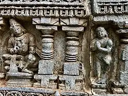 It is found in the Vedic literature. Namas-krita and related terms appear in the Hindu scripture Rigveda such as in the Vivaha Sukta, verse 10.85.22[10] in the sense of "worship, adore", while Namaskara appears in the sense of "exclamatory adoration, homage, salutation and worship" in the Atharvaveda, the Taittiriya Samhita, and the Aitareya Brahmana. It is an expression of veneration, worship, reverence, an "offering of homage" and "adoration" in the Vedic literature and post-Vedic texts such as the Mahabharata.[11][12] The phrase Namas-te appears with this meaning in Rigveda 8.75.10,[13] Atharvaveda verse 6.13.2, Taittirya Samhita 2.6.11.2 and in numerous other instances in many early Hindu texts.[14] It is also found in numerous ancient and medieval era sculpture and mandapa relief artwork in Hindu temples.[15]