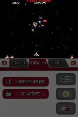 Namco Museum DS is a compilation of several games previously released by Namco, primarily ones released in arcades.[1] All of the arcade games in the collection are ran through emulation.[1] When playing a game, the top screen of the Nintendo DS by default shows the gameplay, while the bottom screen is devoted to options, allowing the player to change their controls. The player can also tweak how the game is displayed, being able to play it either vertically or horizontally, the former requiring the player to hold their DS on its side.[1] Additional settings available to the player include ones that allow them to customize the difficulty of the game their playing, as well as a "hardcore" mode that allows the player to make several manual adjustments to the game by adjusting DIP switches on a simulated replica of the game's arcade system motherboard.[2][1]