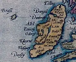 While the brazilwood root of Brazil is generally accepted, it has been occasionally challenged. Among the alternative hypotheses is that it is named after the legendary island of Brasil.[17] Many 14th-century nautical maps denoted a phantom island called insula brasil in the north Atlantic Ocean, usually circular in shape and located just southwest of Ireland. Although its source is uncertain, it is sometimes believed this brasil stems from Celtic word bress, which means "to bless", and that the island was named Hy-Brasil, or "Island of the Blessed".[17] Such an island might have been spoken of in legendary old Irish immrama, then filtered into seafarer's tales, before being incorporated into maps by Italian cartographers, beginning with the 1325-30 portolan chart of Angelino Dalorto.[18]