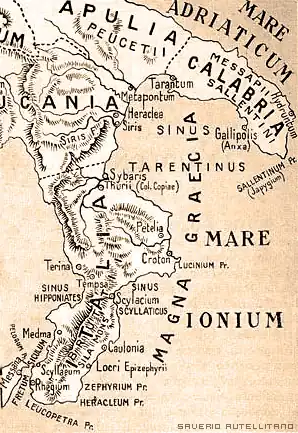 One theory is that the name derives from the word Italói, a term with which the ancient Greeks designated a tribe of Sicels who had crossed the Strait of Messina and who inhabited the extreme tip of the Italic Peninsula, near today's Catanzaro.[2] This is attested by the fact that the ancient Greek peoples who colonized present-day Calabria, referred to themselves as Italiotes, that is, inhabitants of Italy.[3] This group of Italian people had worshiped the simulacrum of a calf (vitulus, in Latin), and the name would therefore mean "inhabitants of the land of calves".[2] In any case, it is known that in archaic times the name indicated the part located in the extreme south of the Italian Peninsula.[3]