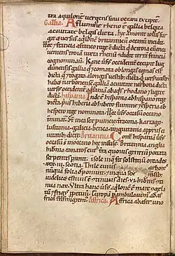 The Divisio orbis terrarum mentioned the British Isles as the Insulae Britannicae or Insulae Britanicae.[29] The text refers to the archipelago together with Gallia Comata: "Gallia Comata, together with the Brittanic islands, is bounded on the east by the Rhine, …" (Latin: Gallia Comata cum insulis Brittanicis finitur ab oriente flumine Rheno, …).[77] According to the editor Paul Schnabel in 1935, the manuscript traditions spelt the name variously as: brittannicis, britannicis, or britanicis.[77]