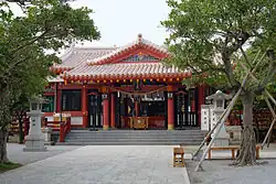 The shrine was destroyed in the 1945 battle of Okinawa; the honden (main hall) and shrine office were rebuilt in 1953, as was the worship hall (haiden), eight years later. Construction of a number of other buildings, including a number of smaller shrines within the grounds, was completed in 1993.