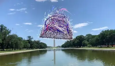 On July 4, 2020, Baker Cahill presented Liberty Bell, six public site-specific animated artworks commissioned by Art Production Fund that appeared in culturally significant sites across the Eastern United States: the Boston Tea Party harbor; the Washington Monument; the "Rocky Steps" in Philadelphia; the Fort Tilden Army installation; Fort Sumter; and the Edmund Pettus Bridge in Selma, Alabama.[41][8][42] The animation depicted a floating, shape-shifting coil of red, white and blue brushstrokes roughly approximating a swaying, abstracted Liberty Bell—accompanied by a raucous soundtrack—which built toward arrhythmic dissolution but retained cohesion.[4][43] Artillery wrote that the "writhing, seething mess of threads" and tolling bell "embodies the turbulent political discourse of an election year and the fraying state of American democracy."[6] Smithsonian Magazine described the work as a timely reflection on liberty, freedom and injustice, "when communities are reckoning with the racist legacies of historical monuments across the country and, in many cases, taking them down."[41]