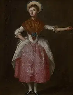 The hornpipe by which she danced into fame was performed to a tune (thought to be probably by Thomas Arne)[3] which then had words set, a song called Ballad of Nancy Dawson attributed to George Alexander Stevens. It was for a long time the popular air of the day. It was set with variations for the harpsichord as Miss Dawson's hornpipe, was introduced in Carey's and Bickerstaffe's opera ‘Love in a Village,’ and is mentioned as ‘Nancy Dawson’ by Oliver Goldsmith in the epilogue to She Stoops to Conquer.[4]