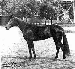 While owned by John Malcolm Forbes, on September 28, 1892, the brown mare trotted a mile in 2 minutes and 4 seconds at Terre Haute's Four Cornered Track with a bicycle sulky, breaking all Sunol's mark of 2 minutes 8.25 seconds set in 1891.[2] Nancy Hanks lost one race heat (in her first start), but was undefeated in her races. She was inducted into the Harness Racing Museum & Hall of Fame in 1955.[3]