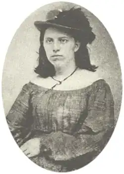 For nearly two years Hart worked for the Moccasin Rangers as a spy and a scout, posing as a farm girl to gather intelligence. She saved the lives of a number of wounded Confederate soldiers by hiding them with sympathizers. She also personally led several cavalry raids against federal outposts. After one such skirmish she was briefly captured, but she persuaded the Union soldiers to let her go based on the fact she was a woman. In early 1861, after a contingent of Union troops passed through her town, Hart's sympathy for the Confederacy prompted her to leave home and join the Moccasin Rangers, led by the infamous Perry Conley. Conley died in the summer of 1862, and with his loss the Moccasin Rangers disbanded, although Hart continued to spy on Union movements. She became a valuable asset to the Rangers, serving both as a spy and a guide to the local region. Hart became so famous and such an enigma for Union forces in West Virginia that a reward was offered for information leading to her capture in 1862. Shortly thereafter, she and a female friend were captured by Union troops led by Lt. Col. Starr and taken prisoner in Summersville, West Virginia. Here, she was photographed unsmiling and unemotional, by an itinerant photographer.[1] According to legend, Hart did not smile because of the attire she had to wear for the picture. Civil War telegrapher Marion H. Kerner, an officer who befriended Hart at the encampment, later made her story famous in the magazine, Leslie's Weekly.[2] That same night, Hart escaped from the Union camp on Starr's horse and joined a regiment of about 200 Confederate soldiers led by Major R. Augustus Bailey (the Moccasin Rangers had been disbanded since the death of Perry Conley). A week later, the Confederate troops overran Summersville, burning many of the public buildings and taking Lt. Col. Starr prisoner. Marion Kerner was also captured, but due to the kind treatment he had given Hart during her own imprisonment, she convinced the Confederate officers to release him. However, he was promptly recaptured after attempting to relay a telegram to Union forces. He was released at the war's end. Francis Miller's 1911 "Photographic History of the Civil War" repeats the claim Hart was captured by Lt. Col. Starr of the 9th West Virginia; a photograph was taken of Hart; she killed a guard with his own gun and a week later led a Confederate unit which captured Starr and the 9th West Virginia July 25, 1862.[3] Official Records of the Civil War mention the capture of Companies "A" and "F" of the 9th West Virginia Infantry at Summersville, West Virginia, July 25, 1862—but have no mention of an arrest/escape of a Nancy Hart in 1862.[4] Likewise the Official W.V. Adjutant General Report on the 9th W.V. do not show any casualties for July 18–25, 1862[5]