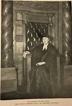 Nancy Hodges (October 28, 1888 – December 15, 1969) was a Canadian journalist and politician. Over her career, she served as a Member of the Legislative Assembly of British Columbia, as the Speaker of the Legislative Assembly of British Columbia, and as a member of the Senate of Canada. She was the first woman in the Commonwealth of Nations to become Speaker, and was known as a powerful women's rights activist in the Commonwealth.[1]