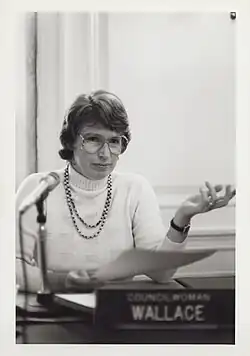 After graduating from Smith college, Wallace began working with inner city teenagers, first with the YWCA in Patterson, NJ and then in Harlem, NY as part of her graduate studies at Union Theological Seminary. In the mid-1960s, after she and her husband Bruce moved to White Plains, NY, she became heavily involved in community issues there, including working with the local PTA on a plan to desegregate the public school system and advocating for responsible community development and conservation as president of the Fisher Hill Neighborhood Association.[4] That community involvement and organizing led to her serving on the city's Planning Commission, and then, in 1977, being elected to the White Plains Common Council. As a Councilwoman she was responsible for passing the city's groundbreaking, anti-discriminatory Fair Housing Law and for negotiating greater greenspace in the city's urban development plans.[5]