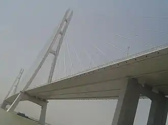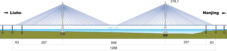 The Nanjing Dashengguan Yangtze River Bridge, formerly Third Nanjing Yangtze Bridge, is the first cable-stayed bridge with steel tower stanchions located in Nanjing, China.[1] It is the third crossing of the Yangtze River at Nanjing. The cable-stayed portion is just a part of the 4.7 kilometers of the complete bridge. Constructed in slightly more than two years at a cost of $490 million, this bridge features dual 215 meters towers. The main span measures 648 meters. When it was completed in 2005 it was the third longest cable stayed span in the world.[2] It still ranks among the top 20. The bridge carries the G42 Shanghai–Chengdu Expressway and the G2503 Nanjing Ring Expressway. The bridge has renamed on 20 December 2019.[3]