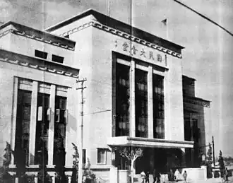 In September of the 24th year of the Republic of China (1935), the central committee of the KMT[5] passed a resolution which approved the construction of a meeting hall for the National Assembly in Nanjing, the capital of China at that time. Since the National Assembly would only meet infrequently, the proposal submitted by H.H. Kung (Chinese: 孔祥熙)[6] and four others also utilized the hall as the National Theatre of Drama and Music. The organizing committee of the National Theater of Drama and Music and the neighboring Art Gallery held a public bidding. According to the evaluation of the organizing committee, the design proposal of Xi Fuquan (Chinese: 奚福泉),[7] an architect from the Gongli Engineering Department (Chinese: 公利工程司), was chosen as the best one, and Guan Songsheng's (Chinese: 关颂声),[8] design and Zhaoshen's (Chinese: 赵深)[9] ranked second and third respectively. On November 20, the organization announced the bidding in public, which was awarded to Shanghai Construction Factory of Lugen's Engineering Office (Chinese: 上海陆根记营造厂).[10] The designer was Xi Fuquan, and the supervisor was Li Zongkan (Chinese: 李宗侃) from Tao's Engineering Office (Chinese: 陶记工程事务所). On May 5 of the 25th year of Republic of China (1936), the construction of the great hall was completed. The great hall was used as the National Theatre of Drama and Music as well.