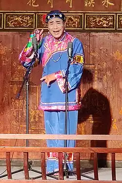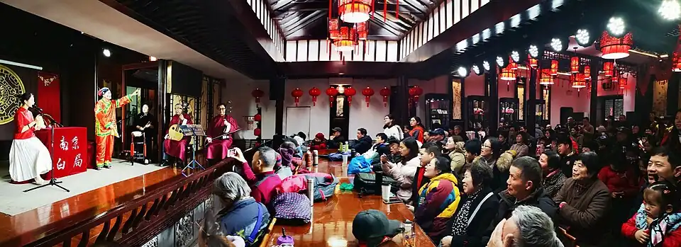 Baiju (Chinese: 白局) or Nanjing baiju, also called baiqu (Chinese: 百曲), is a traditional type of Chinese singing-storytelling and a form of quyi, formed in the rural Luhe District in the city of Nanjing during the Yuan dynasty more than 600 years ago. Though belittled by the upper class, baiju was very popular among the lower classes. It is also the only kind of old local opera in Nanjing, known as a native art which includes singing and telling in the Nanjing dialect, and is particularly rich in rhyme.[1] Baiju is often performed in the form of a solo monologue or a dialogue, like xiangsheng (a traditional Chinese oral art). When acted, it needs from two to five performers.[2] It is very easy to understand, with strong local characteristics, but unfortunately, due to the decline of both performers and audiences, the prospects for baiju are not optimistic. The origin of its name is performers not receiving any pay for their show ("bai" here means "free", and "ju" means " a show").[1]