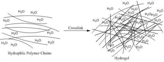 The hydrogel structure consists of cross-linked hydrophilic polymer chains. A semi-permeable membrane or a homogeneous solid mass encapsulate cells. Natural and synthetic hydrogels are used to encapsulate the cells. Algae and sodium alginate provide a commonly used source for polysaccharides. Other natural biomaterials utilized include agarose and chitosan. Synthetic biomaterials include poly(ethylene glycol) (PEG) and polyvinyl alcohol (PVA). Prior to initiation, the biomaterials exist as a liquid monomer. The biomaterials are mixed with cells. Once initiated by pH, temperature, ionic strength, or light control, the biomaterials self-assembles into a solid polymer meshwork. Since the cells are mixed before initiation, this allows for the fabrication of the nano-scaffold construct, and cell seeding in one step. This method contains low mechanical properties due to the highly moldable structure of the nano-scaffold and is not ideal for load-bearing applications.[9]