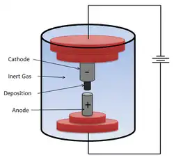 This technique is a variant of the standard arc-discharge technique used for the synthesis of fullerenes in an inert gas atmosphere. As Figure 1.3 shows, the experiment is carried out in a reaction vessel containing an inert gas such as helium, argon, etc. flowing at a constant pressure. A potential of around 18 V is applied across two graphite electrodes (diameters of the anode and cathode are 6 mm and 9 mm) separated by a short distance of usually 1–4 mm within this chamber. The amount of current (usually 50–100 A) passed through the electrodes to ensure nanotube formation depends on the dimensions of the electrodes, separation distance and the inert gas used. As a result, carbon atoms are ejected from the anode and are deposited onto the cathode hence shrinking the mass of the anode and increasing the mass of the cathode. The black carbonaceous deposit (a mixture of nanoparticles and nanotubes in a ratio of 1:2) is seen growing on the inside of the cathode while a hard grey metallic shell forms on the outside. The total yield of nanotubes as a proportion of starting graphitic material peaks at a pressure of 500 torr at which point 75% of graphite rod consumed is converted to nanotubes. The nanotubes formed range from 2 to 20 nm in diameter and few to several micrometers in length.[8] There are several advantages of choosing this method over the other techniques such as laser ablation and chemical vapor deposition such as fewer structural defects (due to high growth temperature), better electrical, mechanical and thermal properties, high production rates (several hundred mg in ten minutes), etc.[9]