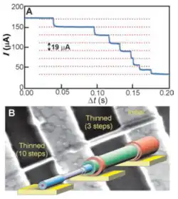 Large-scale synthesis of carbon nanotubes typically results in a randomly varied proportion of different types of carbon nanotubes. Some may be semiconducting while others may be metallic in their electrical properties. Most applications require the use of such specific types of nanotubes. Electrical-breakdown technique provides a means for separating and selecting desired type of nanotubes. Carbon nanotubes are known to withstand very large current densities up to 109 A/cm2 partly due to the strong sigma bonds between carbon atoms. However, at sufficiently high currents the nanotubes fail primarily due to rapid oxidation of the outermost shell. This results in a partial conductance drop that becomes apparent within a few seconds. Applying an increased bias displays multiple independent and stepwise drops in conductance (figure 1.4) resulting from the sequential failure of carbon shells. Current in a MWNT typically travels in the outermost shell due to the direct contact between this shell and the electrodes. This controlled destruction of shells without affecting disturbing inner layers of MWNTs permits the effective separation of the nanotubes.[10]
