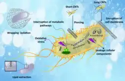Recently, carbon-nanotubes have been shown to have antibacterial properties. They disrupt normal bacterial function by causing physical/mechanical damage, facilitating oxidative stress or lipid extraction, inhibiting bacterial metabolism, and isolating functional sites via wrapping with CNM-containing nanomaterials.[93]