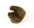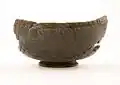 The vessel is a shallow, hardwood bowl without handles, with a broad flat foot. Originally it would have stood 10 cm in height, with a diameter of 12 cm, although it has been extensively damaged over the years and slightly less than half of the bowl remains. Unlike other examples of mazers, it has no boss or knob in the centre of the inside, and there is no evidence that one has been removed or lost due to damage.[6] It is fashioned from hardwood, most likely wych elm, with no visible decorations. A groove which may previously have held a metal rim runs around the lip.[10]