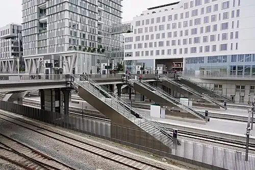 Nanterre La Folie (French pronunciation: [nɑ̃tɛʁ la fɔli]) is a railway station in Nanterre, Hauts-de-Seine, France. Formerly, the area contained a cargo station of SNCF. It was built as part of the extension of RER E from Haussmann Saint-Lazare station and opened on 6 May 2024, and acts as its western terminus.[2] From 2027, RER E will be further extended to Mantes-la-Jolie. The station connects via a short walk with the Nanterre-Préfecture station on the RER A.