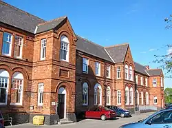 The former workhouse is a large three-storey building in red brick under a tiled roof. It has a U-shaped plan, with a long symmetrical front face and two long end wings which run away from the street.[1][5][13] The front face has a slightly projecting central bay, topped by a pediment bearing a clock face.[1][13] The main entrance is to the central bay; it has a semicircular head with a fanlight, and is flanked by a pair of small windows. The front face has seven casement windows to the ground floor.[1] In around 1971, the central bay had two Venetian windows with a semicircular head; only the second-storey one remains.[13][14] A bell tower and glazed porch to the main entrance have also been removed.[1][14] Little of the original workhouse interior remains.[1]